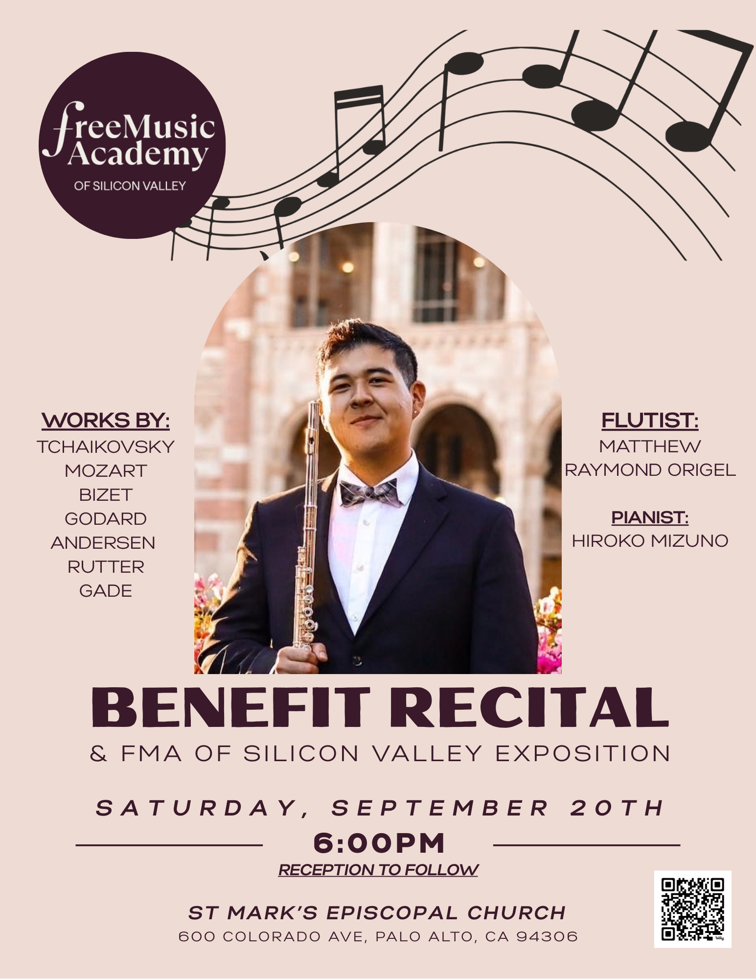 Enjoy an evening of beautiful music with Matthew Origel, founder and professional flutist, performing works by Tchaikovsky, Mozart, Bizet, and more, accompanied by pianist Hiroko Mizuno.